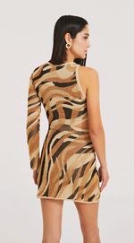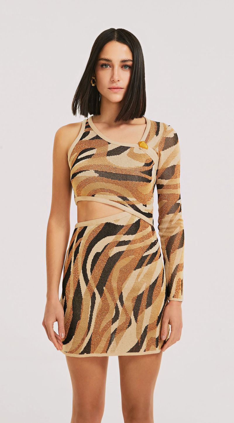 Vestido curto decote assimétrico tricô. Com decote assimétrico ousado e sensual, esse vestido curto feito em tricô de jacquard com uma estampa exclusiva é tudo de mais atual e elegante. O tecido suave e aconchegante envolve o corpo, criando um look moderno e sófisticado. É perfeito para uma noite de balada ou para um evento mais formal. Não perca a oportunidade de adicionar esse vestido ao seu guarda-roupa e se destacar na multidão com sua elegância e personalidade.