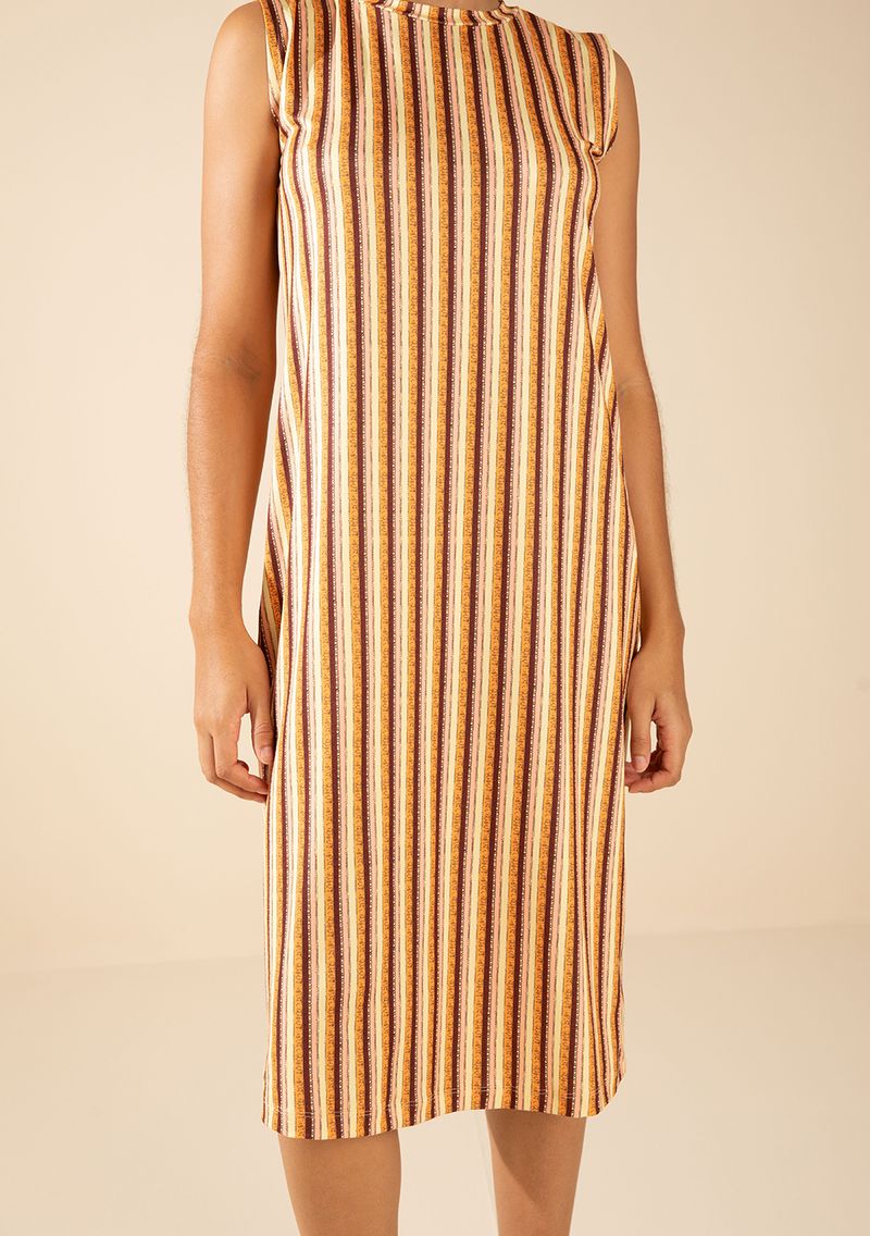 Vestido Morena Rosa Solto Decote Careca Sem Manga Midi Marrom
