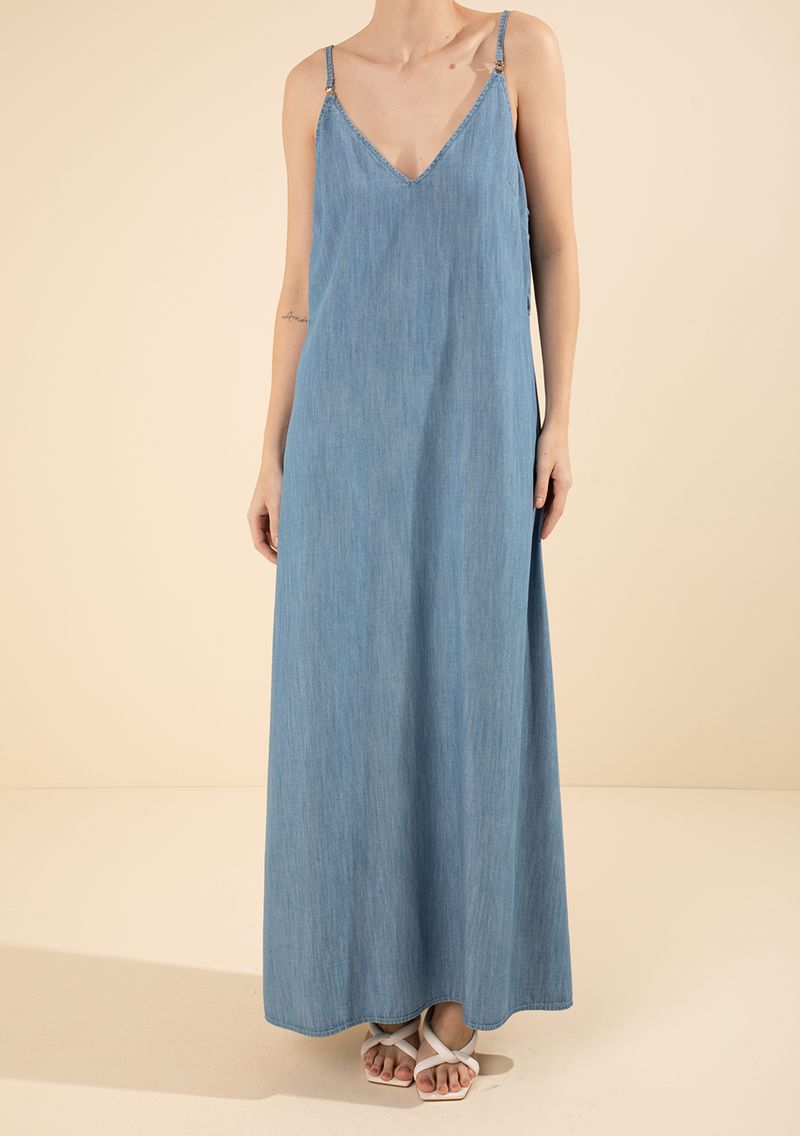 Vestido Morena Rosa Solto Decote V Com Alça Longo Azul