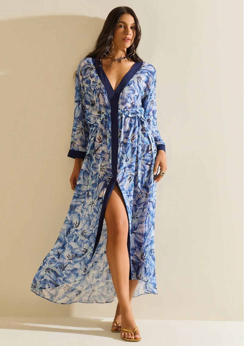 Vestido Morena Rosa Solto Decote V Manga 7 Oitavos Midi Azul
