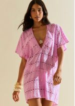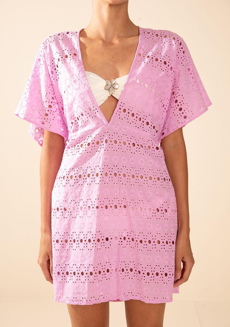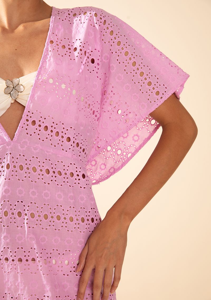 Vestido Morena Rosa Solto Decote V Manga Curta Curto Rosa