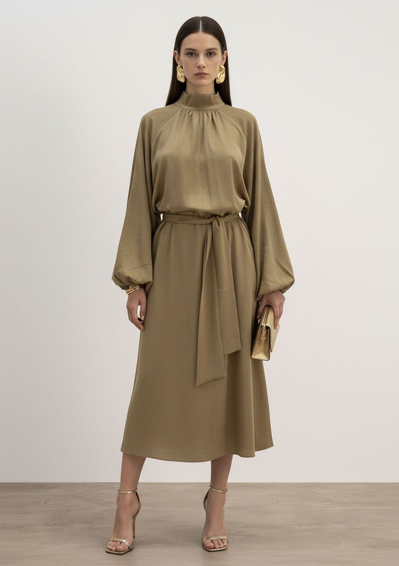Vestido Solto Gola Alta Manga Longa Midi Bege