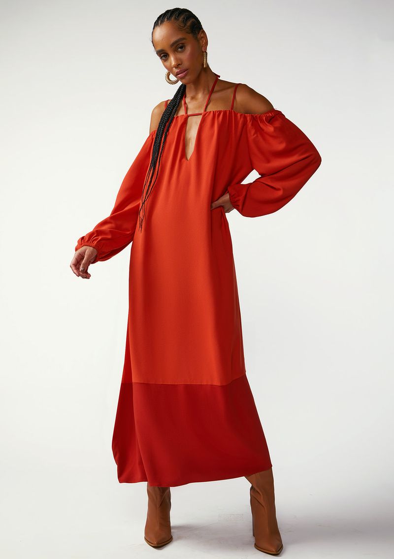 Vestido Zinco Solto Decote Reto Manga Longa Midi Laranja