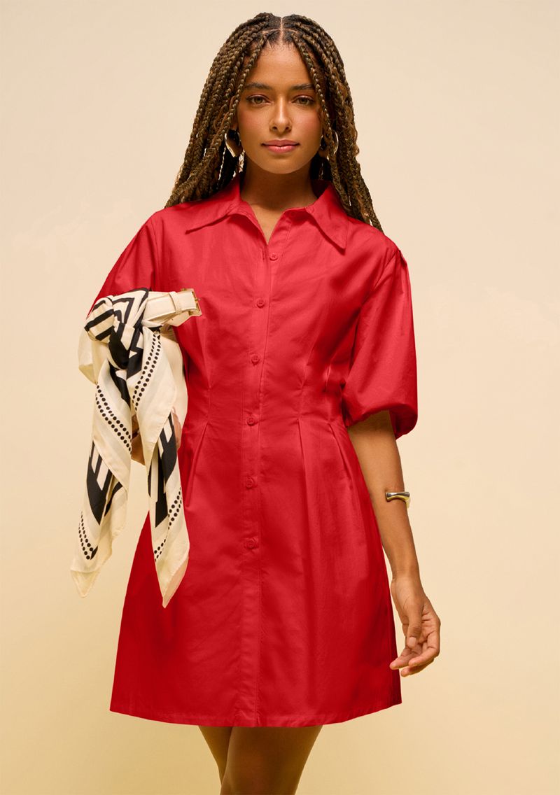 Vestido Zinco Solto Gola Clássica Manga 3 Quartos Curto Vermelho