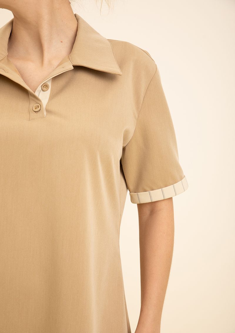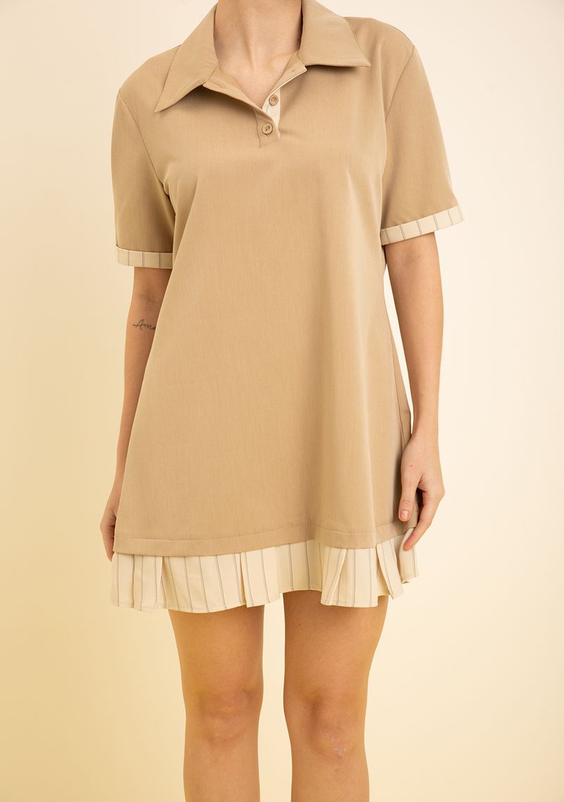 Vestido Zinco Solto Gola Clássica Manga Curta Curto Bege