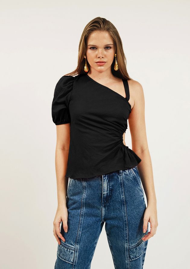 Blusa Zinco Ombro Só Manga Curta Com Franzido Preto