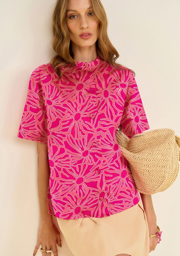Camisa Zinco Ajustada Decote Careca Manga Curta Padrão Rosa
