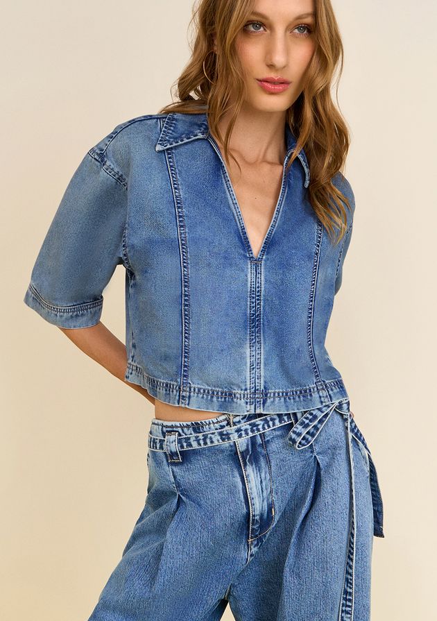 Camisa Zinco Solta Gola Tradicional Manga Curta Padrão Azul