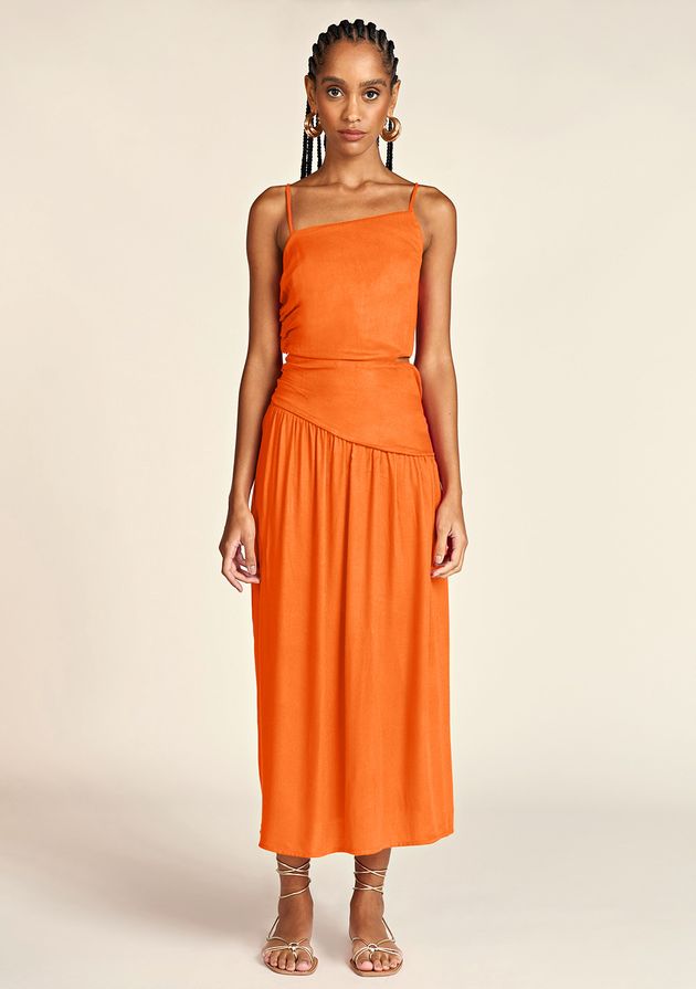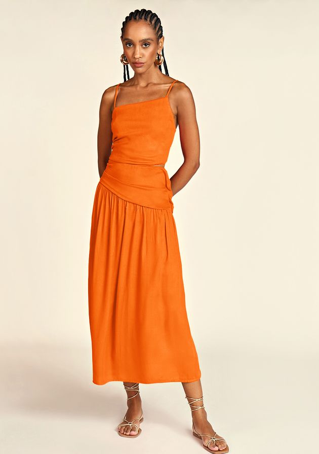 Vestido Zinco Midi Decote Assimétrico Abertura Lateral Laranja